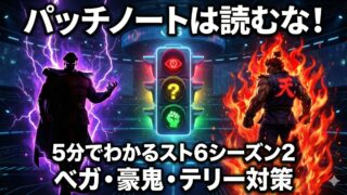スト6シーズン2のパッチノートが長すぎて読めない方へ。ベガ・豪鬼・テリーの対策やドライブゲージの変更点を、社会人プレイヤー向けに5分で読めるよう要約。週末のランクマで「わからん殺し」を防ぐ最短攻略ガイドです。
