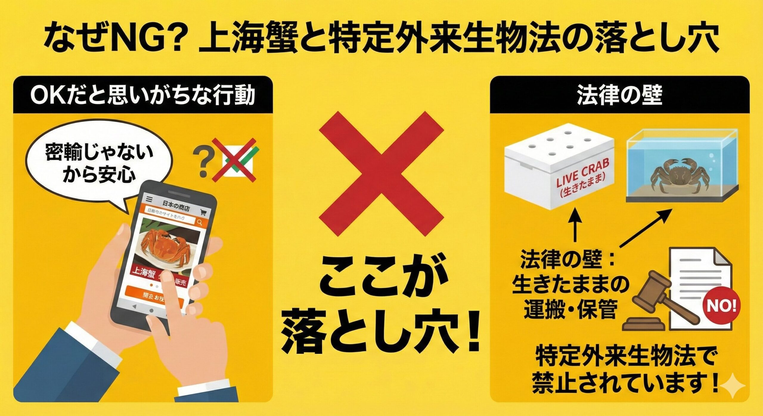 しかし、上海蟹は日本の生態系に悪影響を及ぼす恐れがあるとして、「特定外来生物法」により、許可なく生きたまま「飼養・運搬・保管」することが禁止されています。